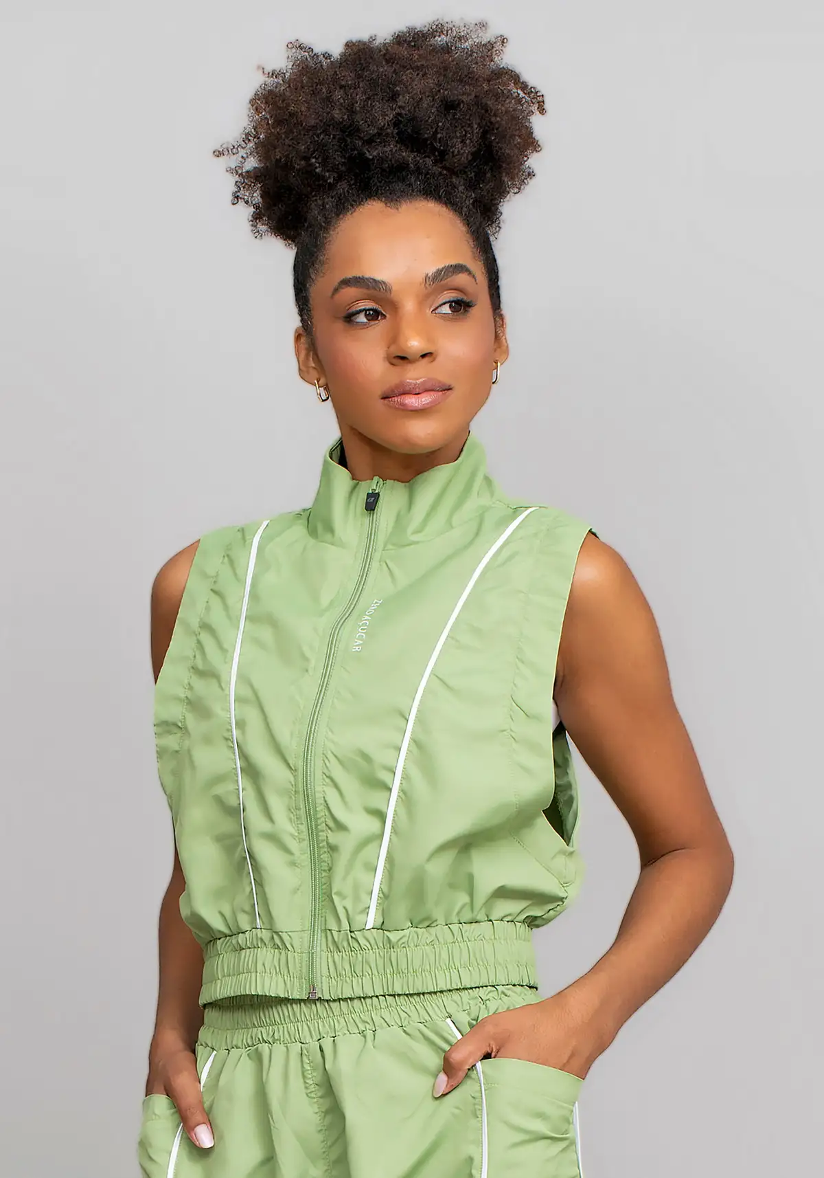 Modelagem college com zíper frontal, gola limpa e visual contemporâneo que funciona tanto com peças esportivas quanto casuais. É a terceira peça ideal para elevar o look sem peso.