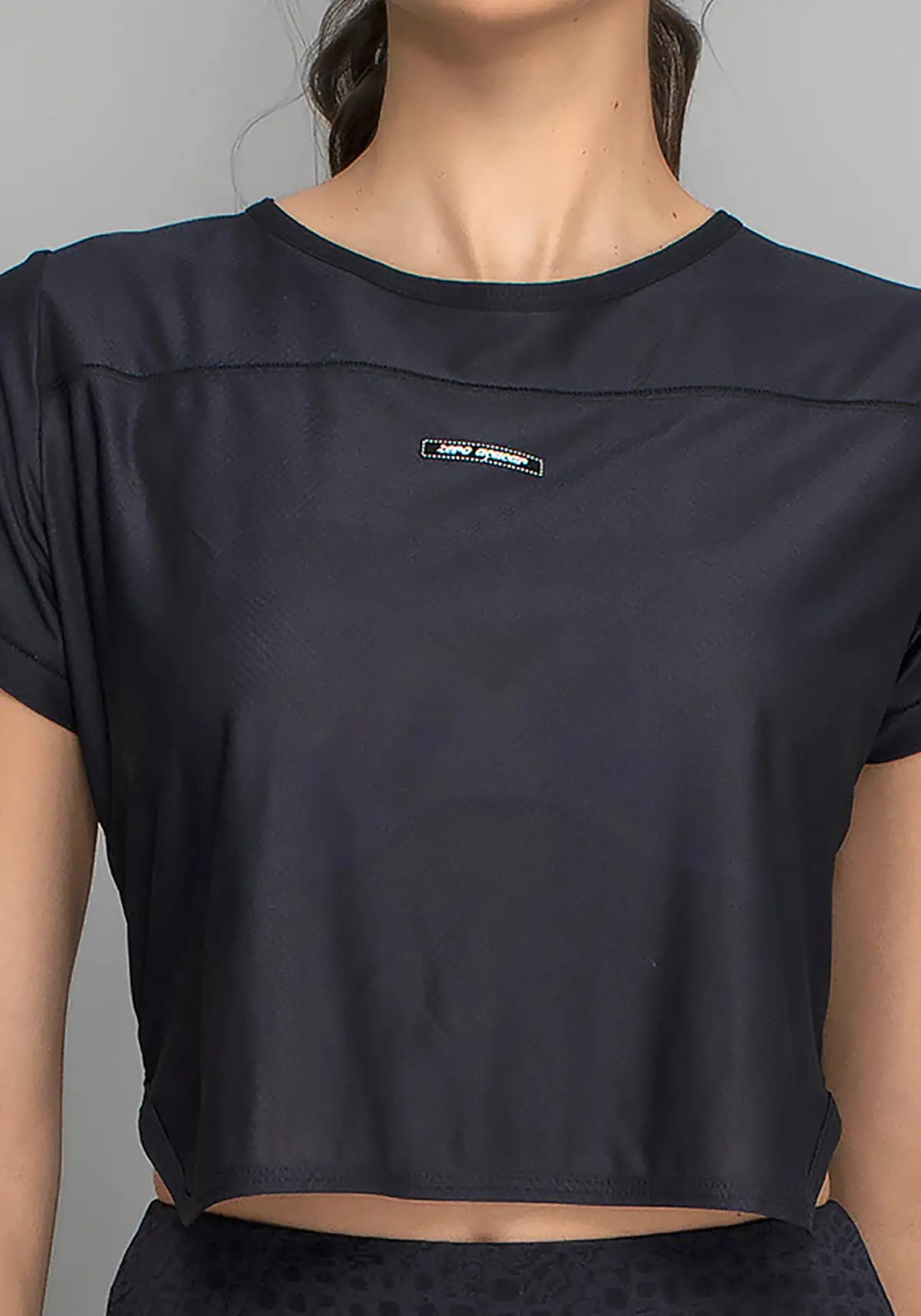 Modelagem cropped moderna, com caimento solto e leve transparência elegante. Visual esportivo contemporâneo que valoriza a silhueta sem apertar.